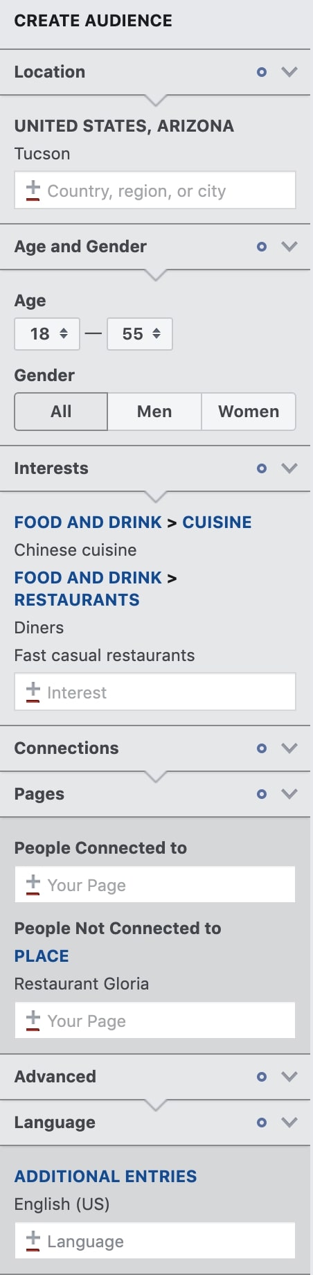 Check out the example below where I filled out a potential audience for a Chinese restaurant located in Tucson, Arizona.