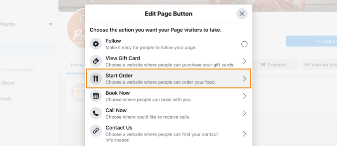 Facebook allows you to create a call to action for your business page. We recommend that you use it for online ordering.