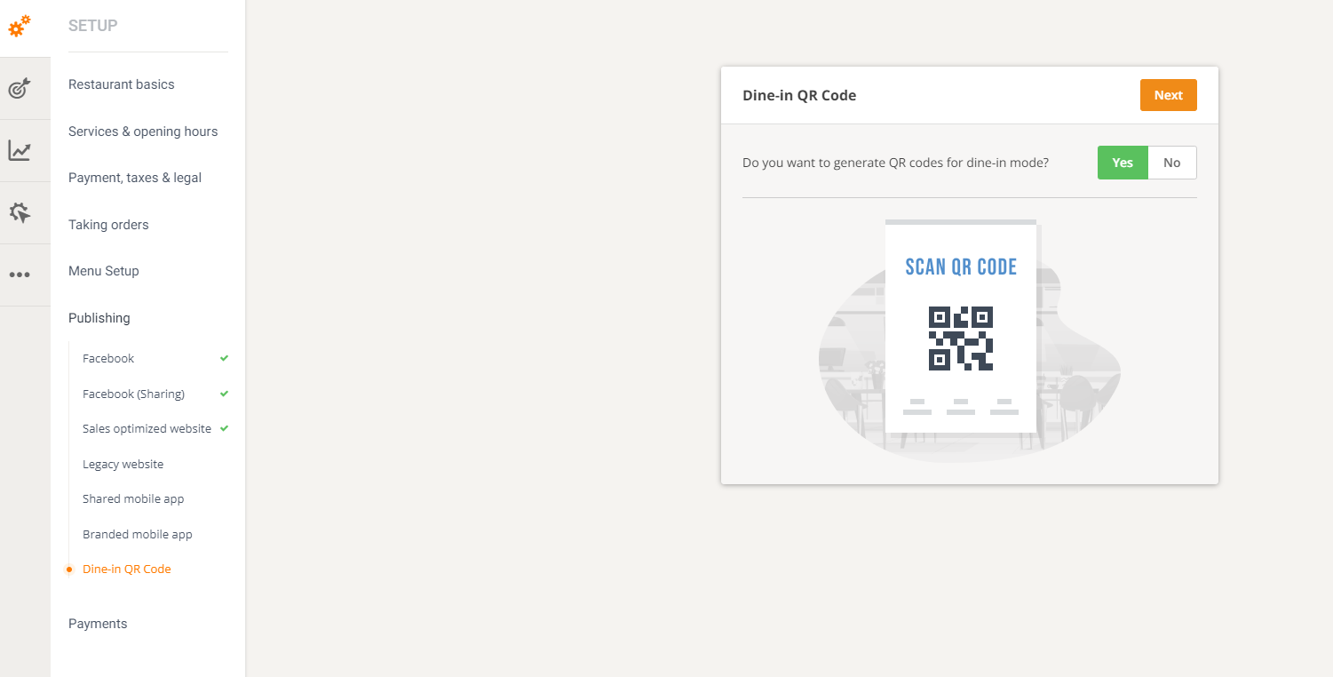 You can get generate your own QR code by going to admin -> Publishing -> Dine in QR code! All there’s left to do is print the flyers that will be displayed across the restaurant.