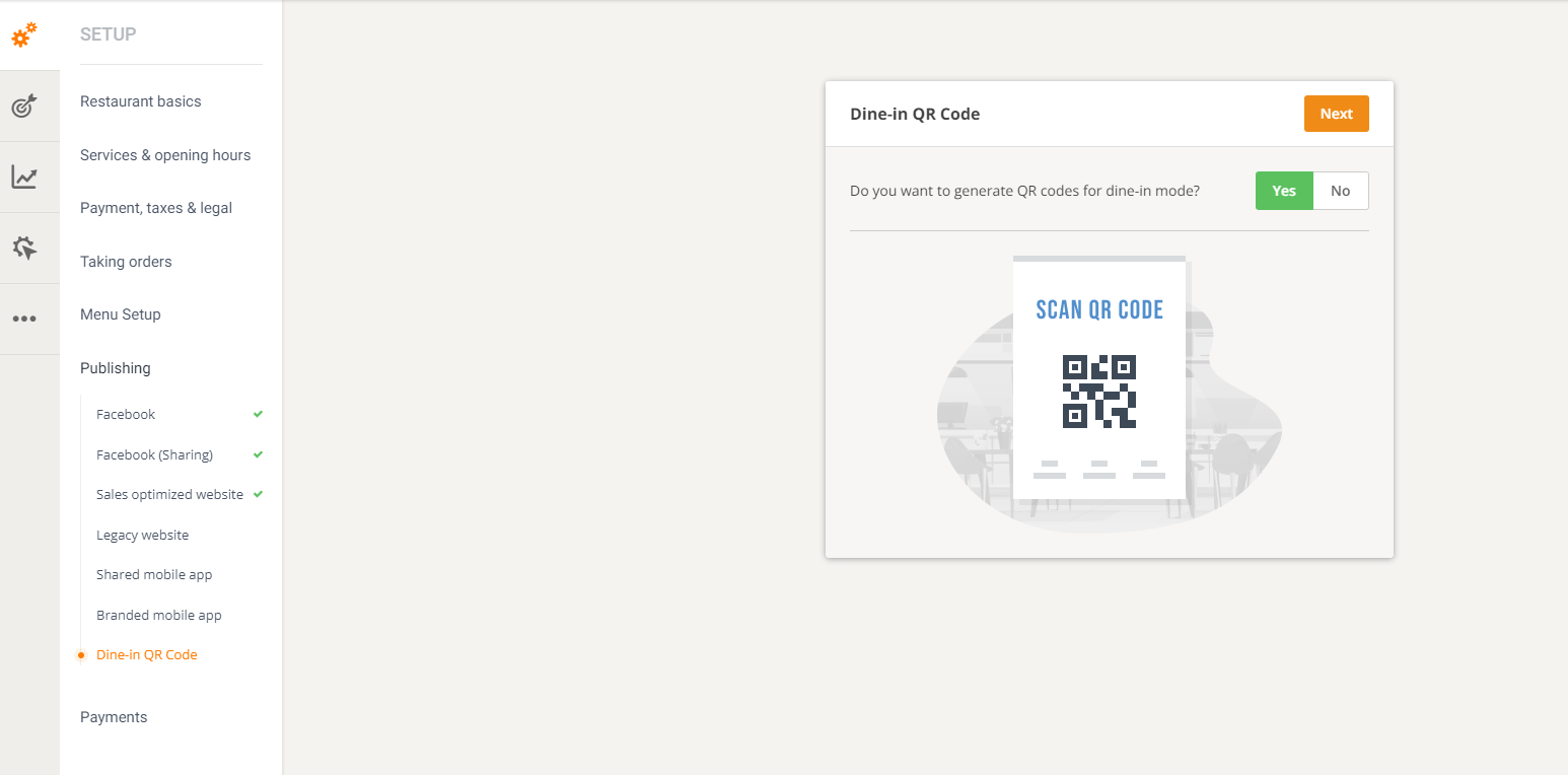 You can get your QR code with the online ordering system from GloriaFood by going to admin -> Setup -> Publishing -> Dine-In QR code.