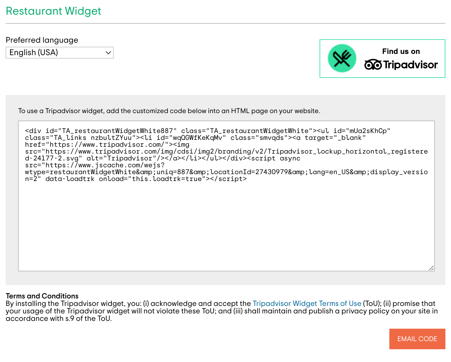 You will be taken to a page where you can customize the language of the widget, and email yourself the HTML code you’ll have to add to your website. If you don’t know how to do that, you can hire remote developers who specialize in web integration to seamlessly add the TripAdvisor restaurant widget to your website.