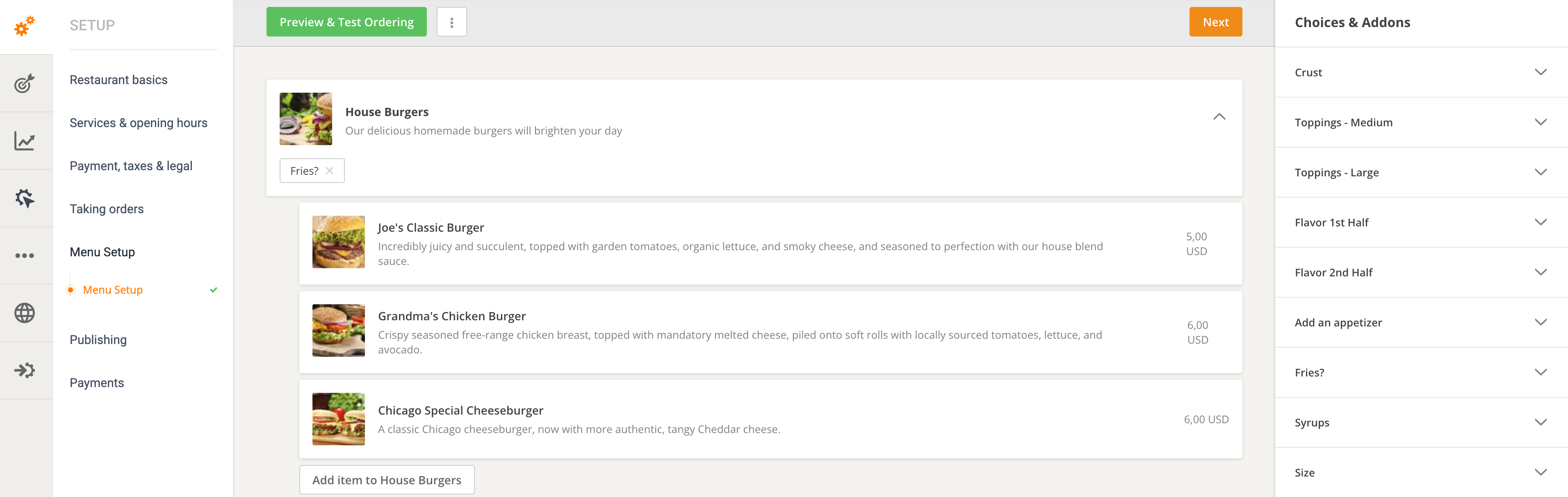 If you’ve already set up your online ordering system following the steps above, you’re almost there. Navigate to your restaurant dashboard -> Setup -> Menu Setup to start crafting your menu by adding categories, subcategories, dishes, choices, add-ons, and more:
