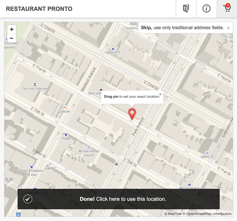 During this step, when ordering for delivery, a map will be shown inside the ordering widget, allowing the customer to position a pin right onto their exact location.