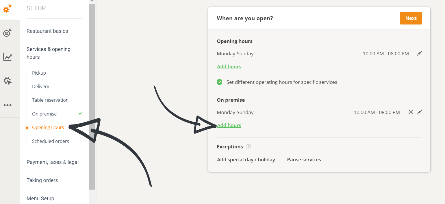 Click on “Next” or navigate to the “Opening hours” section and enter the opening hours for your on premise service. As you can see in the image, you care customize the working hours to your liking, such as: