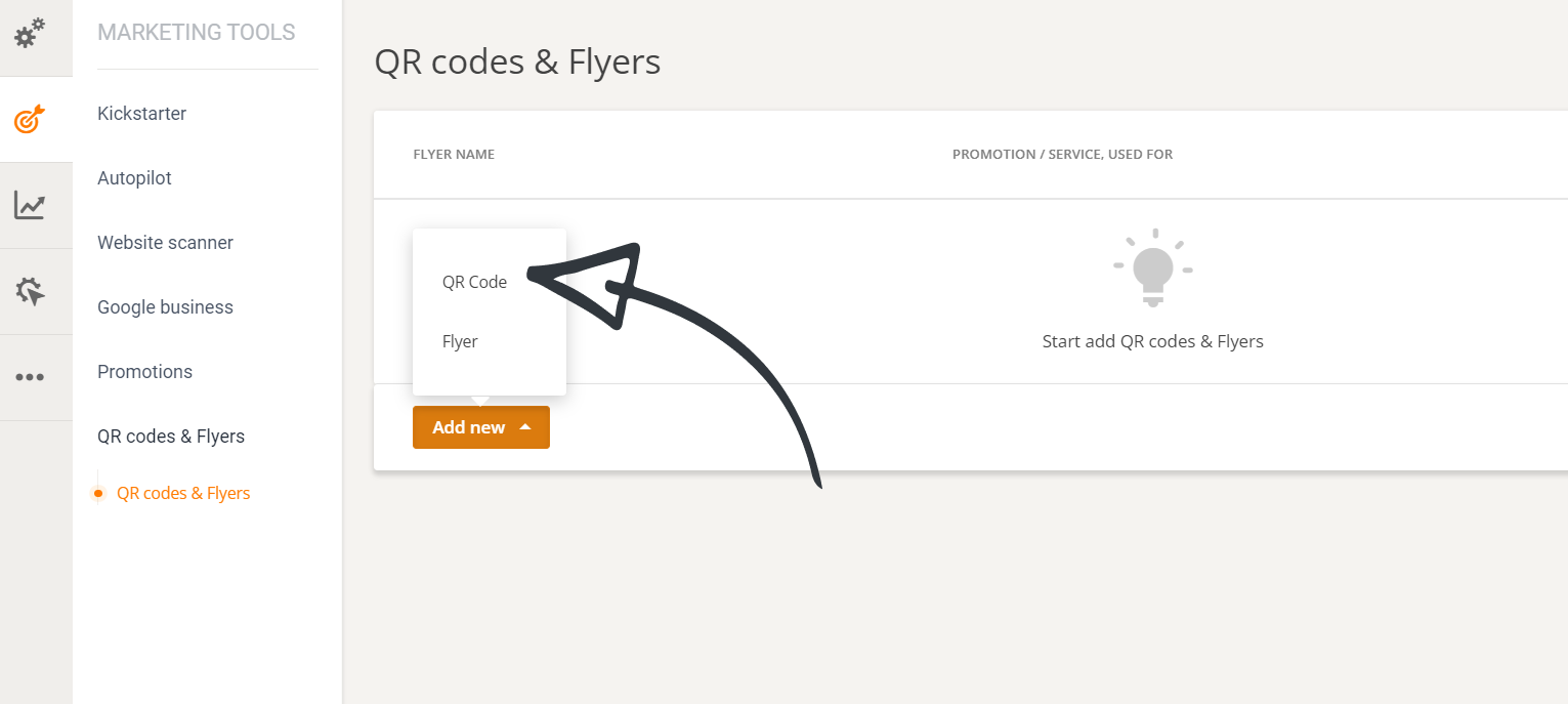 In the “Marketing Tools” section, click on the “QR codes & Flyers” option, then select “QR Code”.