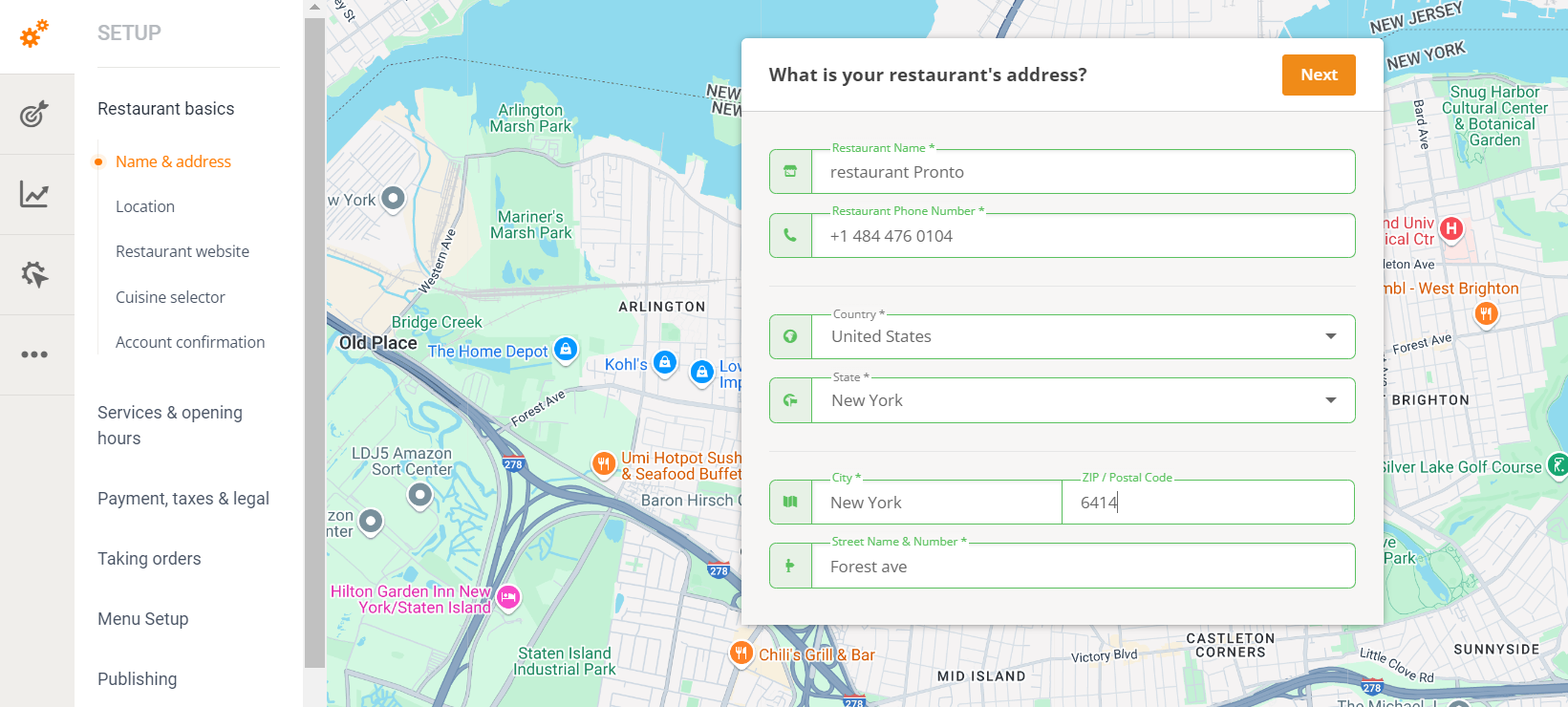 To start accepting QR code orders, you must first create and set up an account with GloriaFood here. Navigate to the “Restaurant basics” section of your dashboard and fill in the required information.