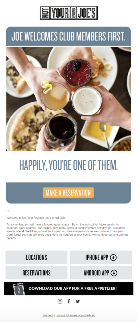 As another example, Not Your Average Joe’s welcomes you with an email stating you’re a member of a club, which already makes you feel special. This is basic personalization, and it looks so good!