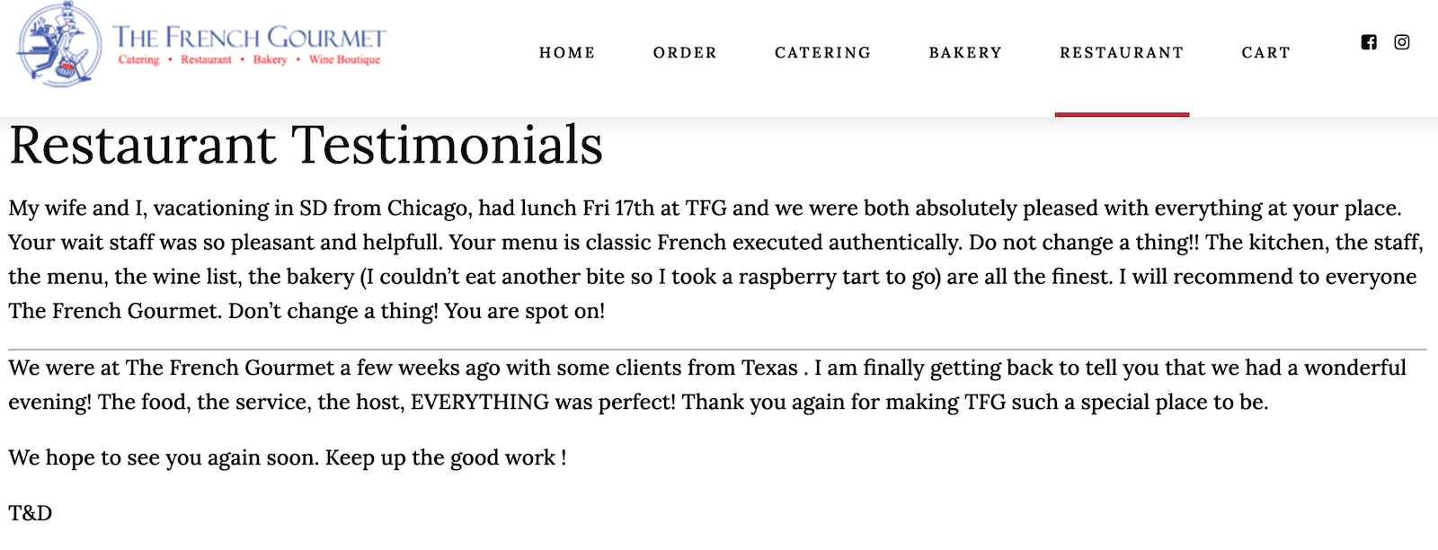 For example, The French Gourmet, a respected restaurant and caterer in San Diego, has a lot of heartfelt, personal testimonials on its website. After reading some of these, we want to visit them once we’re in town!