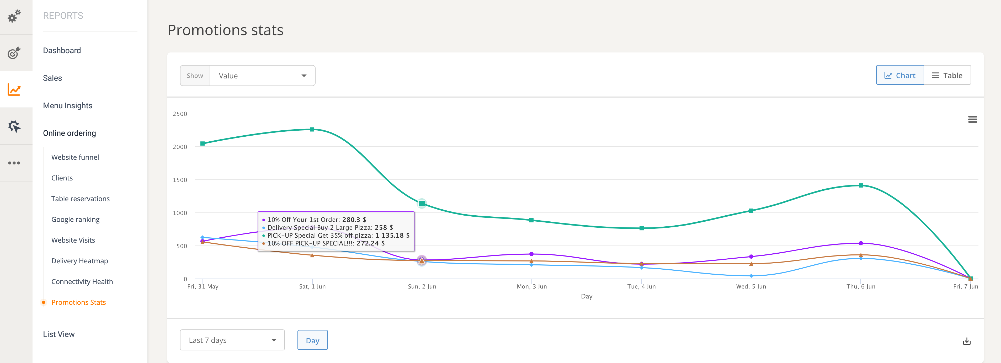Not all restaurant promotions you try will have the desired effects. But without testing out multiple, you won’t know what works and what doesn’t. Promotion stats can show you how each promotion is performing so you can settle on a strong marketing campaign.