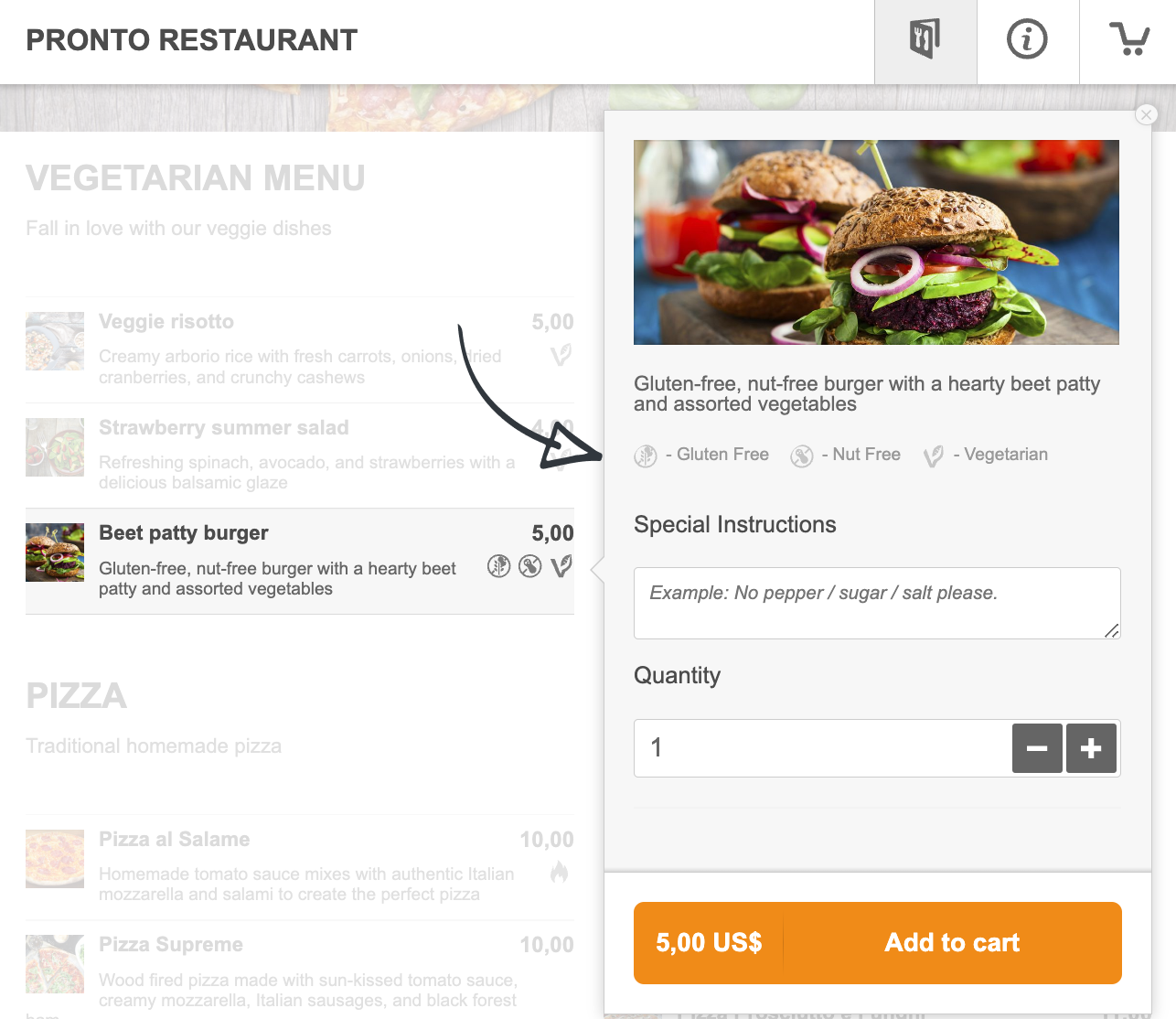 Enable customers to personalize their meals with toppings, sides, choices, and add-ons. For example, maybe they’d like to add tomatoes to their pizza or replace the regular cheese with lactose-free cheese.