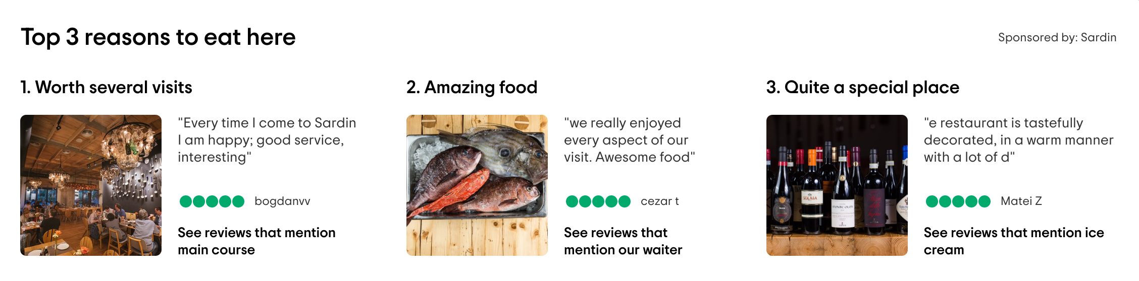 Your top 3 reasons will be displayed on your restaurant listing, right underneath the Overview section. That way, it will be one of the first things customers see when they visit your page.