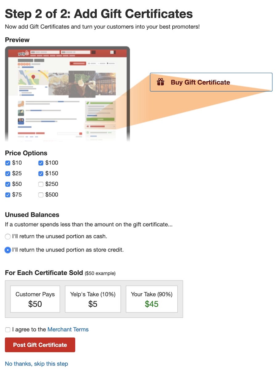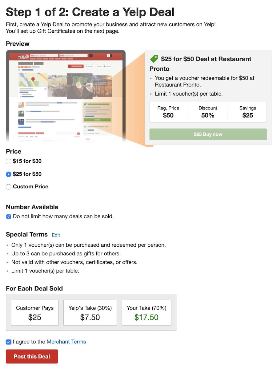 On your Yelp business page, you can also offer customers deals and gift certificates they can redeem immediately. The deals are discounts that you choose. For gift certificates, you can select one or more price options.