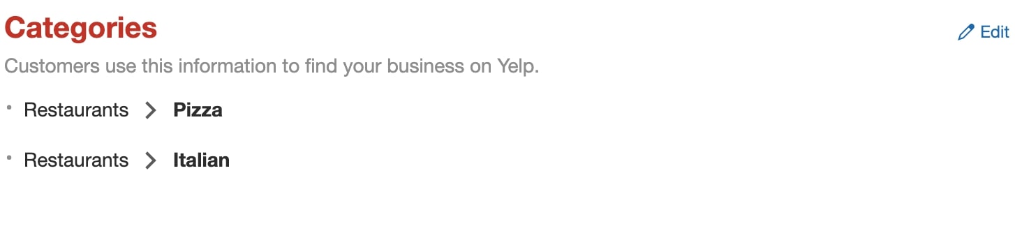 - Business categories – remember when we told you you can choose up to 3 categories and you have to be really specific? That’s why. When you choose a category, it’s like you’re bidding on keywords on Yelp’s search engine.